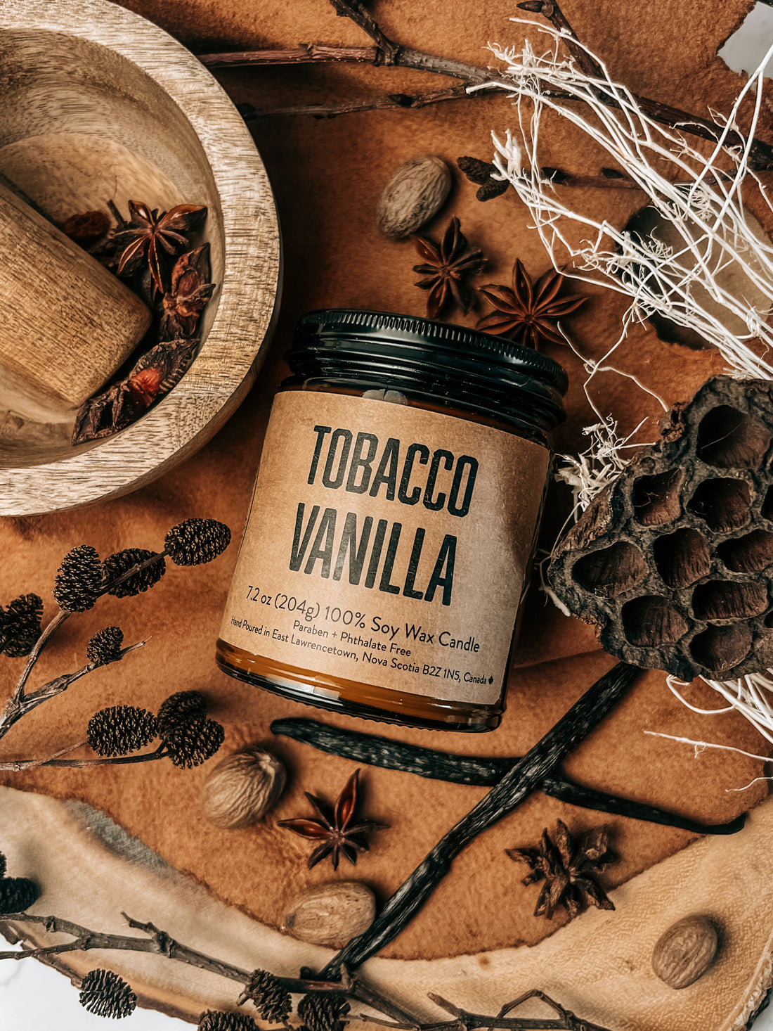 Immerse yourself in the opulent embrace of "Tobacco Vanilla," a fragrance that weaves the rich tapestry of eras gone by with the contemporary zest for life's finest pleasures. This scent is a masterful symphony where the deep, earthy tones of aged tobacco leaf harmoniously blend with the creamy, intoxicating sweetness of Madagascar vanilla, underpinned by a clandestine mix of spices that whispers tales of ancient markets and exotic lands. Each inhalation is a step further into a hidden library of a grand manor, where leather-bound books and heirloom woods form the backdrop to nights of intellectual discourse and whispered secrets. The warm glow of amber lighting captures the essence of sophistication and mystery, making "Tobacco Vanilla" not just a scent, but a journey through time and sensation. Lovingly encased in our signature 100% soy wax, this candle is not only an olfactory masterpiece but a beacon of luxury for your home. Handcrafted with care in Lawrencetown, Nova Scotia, Canada, "Tobacco Vanilla" is an invitation to indulge in the warmth of memories and the excitement of future discoveries.
